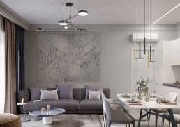 В отделку входит проведение всех коммуникаций, монтируются светильники и двери, кладется напольное покрытие, на стены наносят безопасную краску. В кухне устанавливают итальянский гарнитур, «теплый пол», качественную плитку, современную бытовую технику.